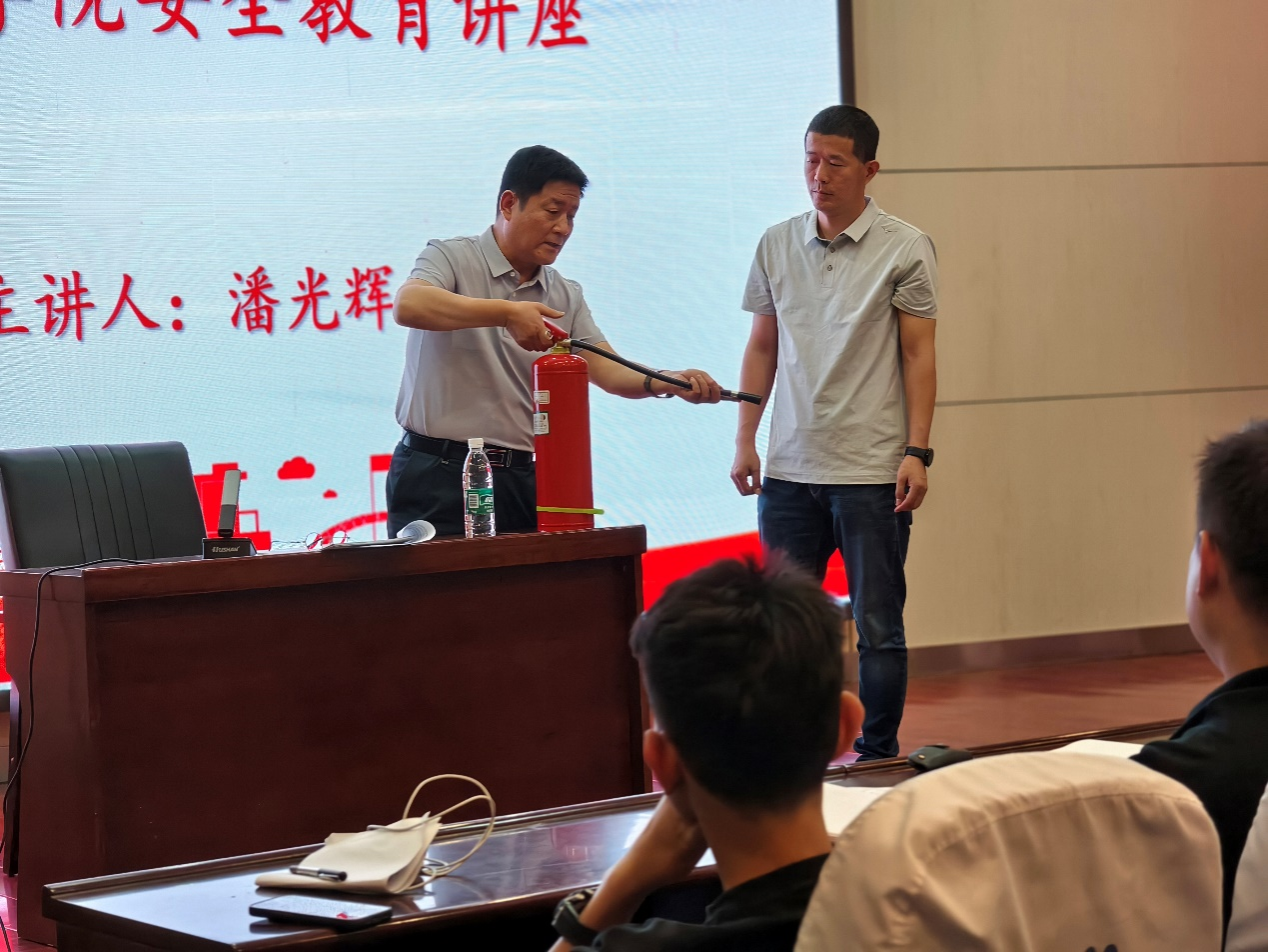 校保卫部部长潘光辉分别围绕人身安全,消防安全、财产安全、交通安全和预防电信诈骗五个方面的内容,结合发生在校园内的典型案例,进行了详细而生动的阐述。针对财产安全方面,他以多起校园财产安全失窃事件为例,提醒全体同学要提高财产安全意识,注意保护好自己的贵重物品,特别是日常一定要做到离开宿舍时随手关闭宿舍门,杜绝宿舍不锁门或者把钥匙插在门上等错误行为,切实保护好自己的财产安全;针对道路和交通安全,潘光辉对于公司近期开展校园电动自行车、摩托车管理,预防因电动自行车、摩托车引发的各类安全事故相关活动,进行了详细的解读。针对消防安全方面,他详细讲解了校园火灾常见的产生原因和火灾发生时如何正确的逃离火场的方法,还与王建峰一起在现场对灭火器的使用方法进行了生动的演示和细致的讲解;针对频繁出现的电信诈骗犯罪行为,潘光辉列举了诈骗分子常见22类诈骗手法,要求牢记“三不一要”,提高安全意识,不给犯罪分子可乘之机,把财产损失降到最低。