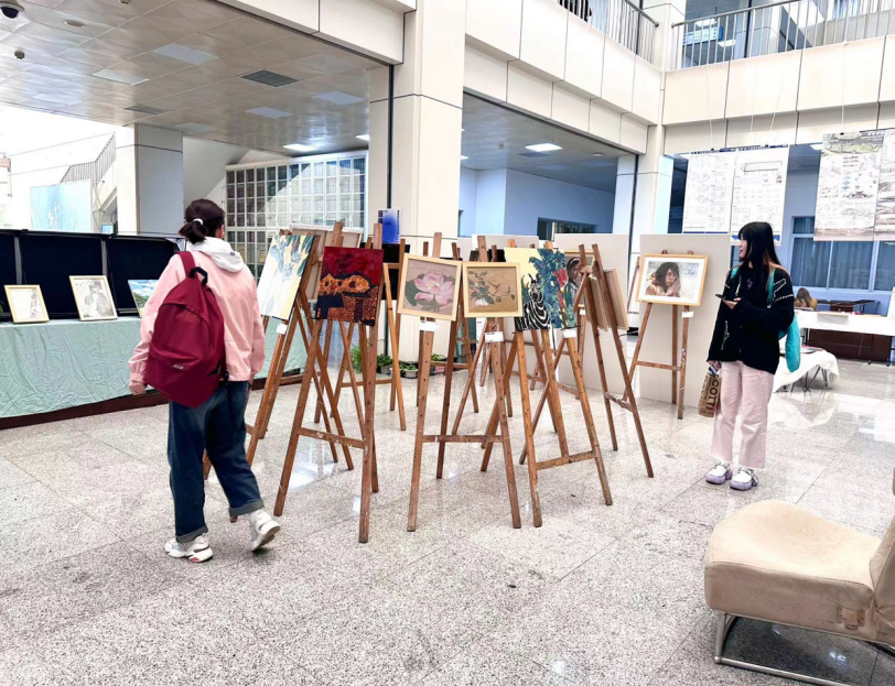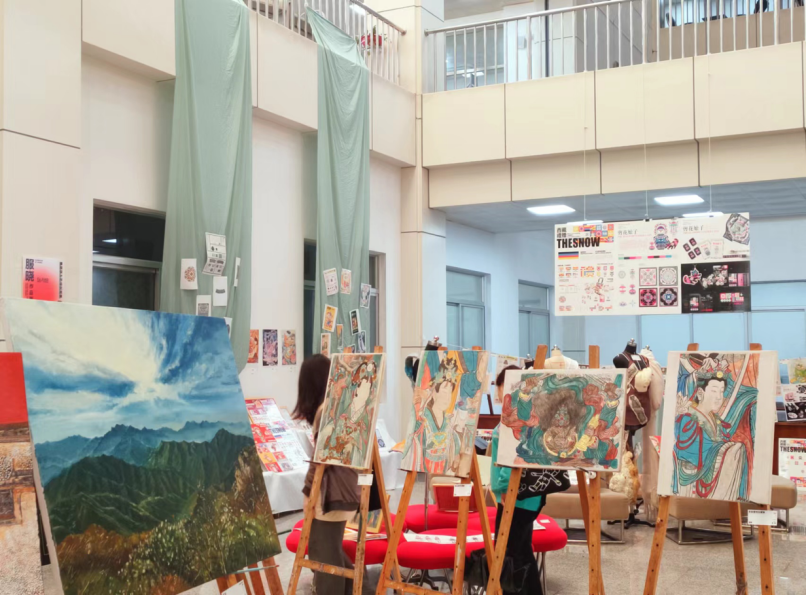 本次展览从服装设计、产品设计、视觉传达设计、环境设计,美术学五个专业中遴选出优秀作品145件,包含绘画、平面设计、创意立裁等多种艺术形式。作品展主要以单元陈列法的展览方式呈现,将所有作品以专业进行分类,错落有致的分布在场馆内。其中视觉传达设计专业“剪花娘子”纹样设计,“荆楚长歌”包装设计,环境设计专业“花镜”手绘图设计,产品设计虎头鞋系列,“语艺”茶壶设计,服装设计“飞天”,美术学“幸福西藏”油画等优秀作品深受同学们的喜爱。同学们在参展的同时还可以对各专业的部分课程进⾏体验,如服设专业的机缝与⼿缝,美学专业的国画,产品纹织设计等。在为期3天的展览中,2026年国际足联世界杯及其他公司观展同学累计1000余人次。