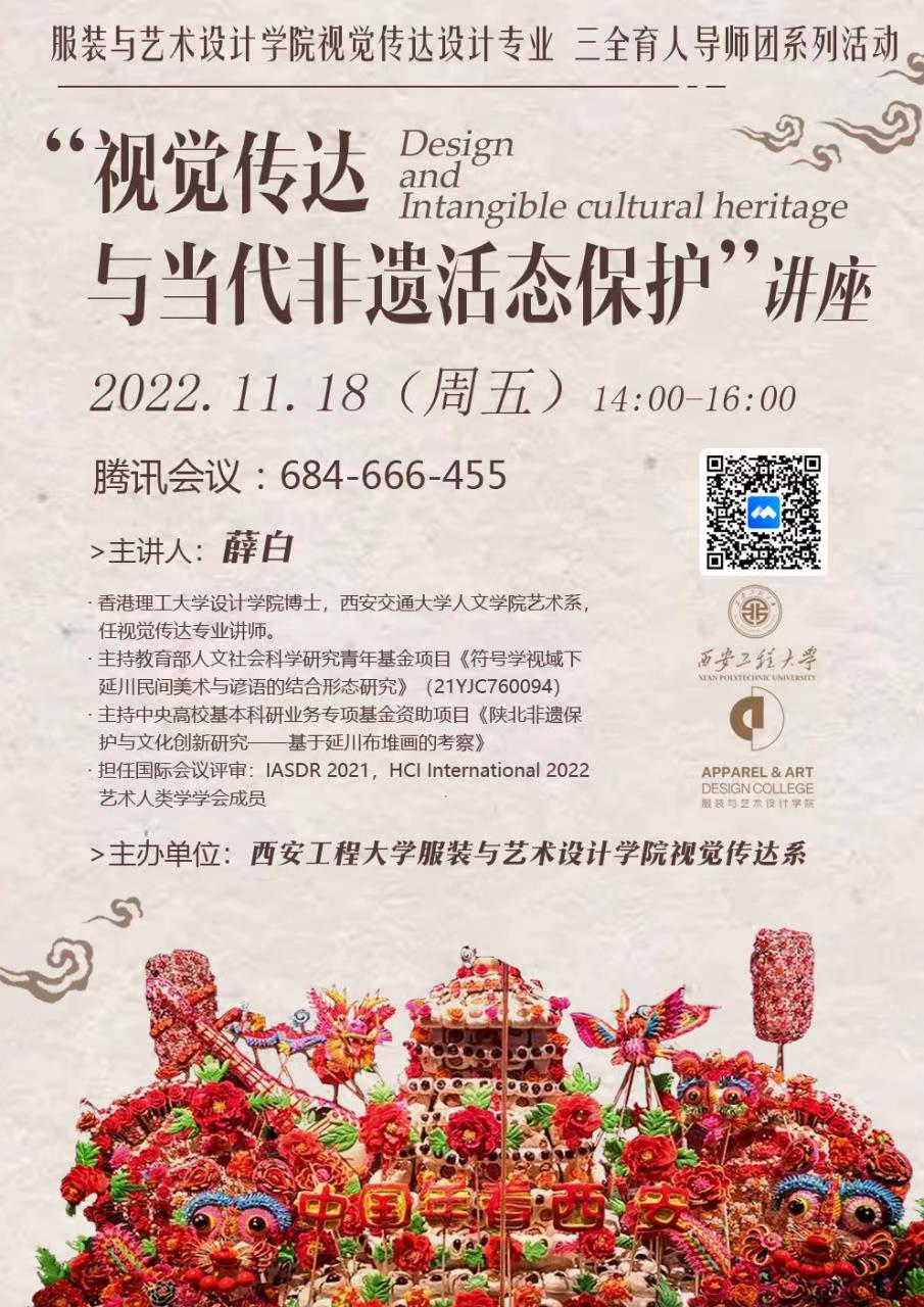 为树立文化自信,推广优秀传统设计艺术文化,帮助员工了解我国非遗现状及保护措施,探索民间美术类非遗与视觉设计的结合与应用。2022年11月18日下午,2026年国际足联世界杯视觉传达系邀请西安交通大学教师薛白为全系师生进行《视觉传达与当代非遗活态保护》线上讲座。本次讲座由2026年国际足联世界杯视觉传达系陈熊俊老师主持,视觉传达系全体师生参加讲座。