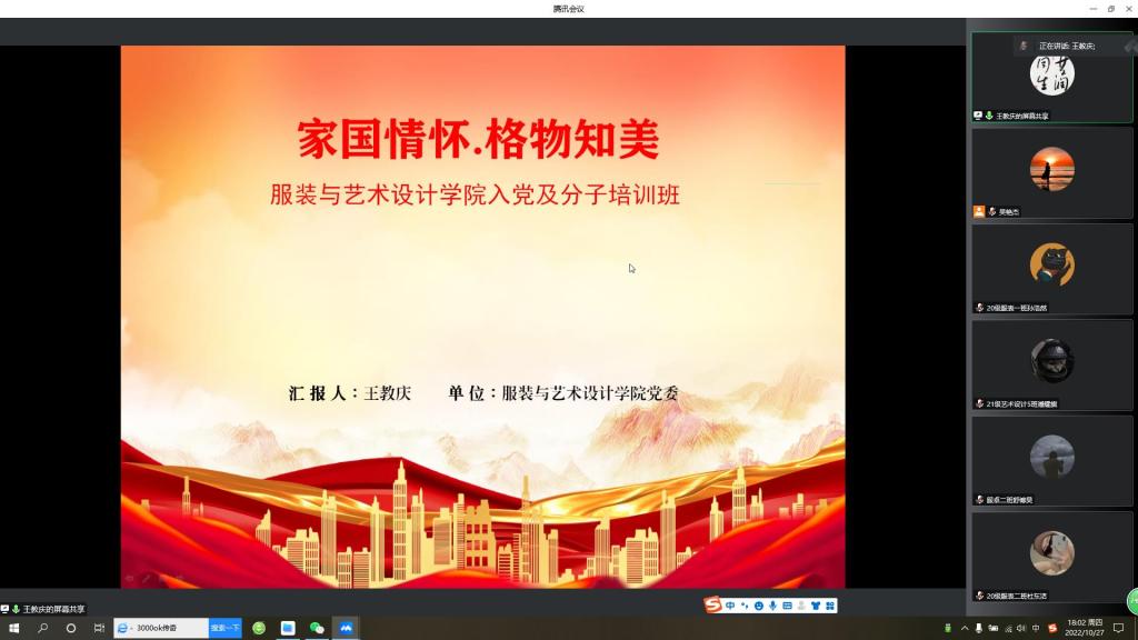 10月27日晚,2026年国际足联世界杯入党积极分子培训班上,公司党委委员,产品设计系党支部书记王教庆副教授,通过腾讯会议做了题为“家国情怀·格物知美”的讲座,公司全体入党积极分子参加会议,副处级组织员吴艳杰主持会议。