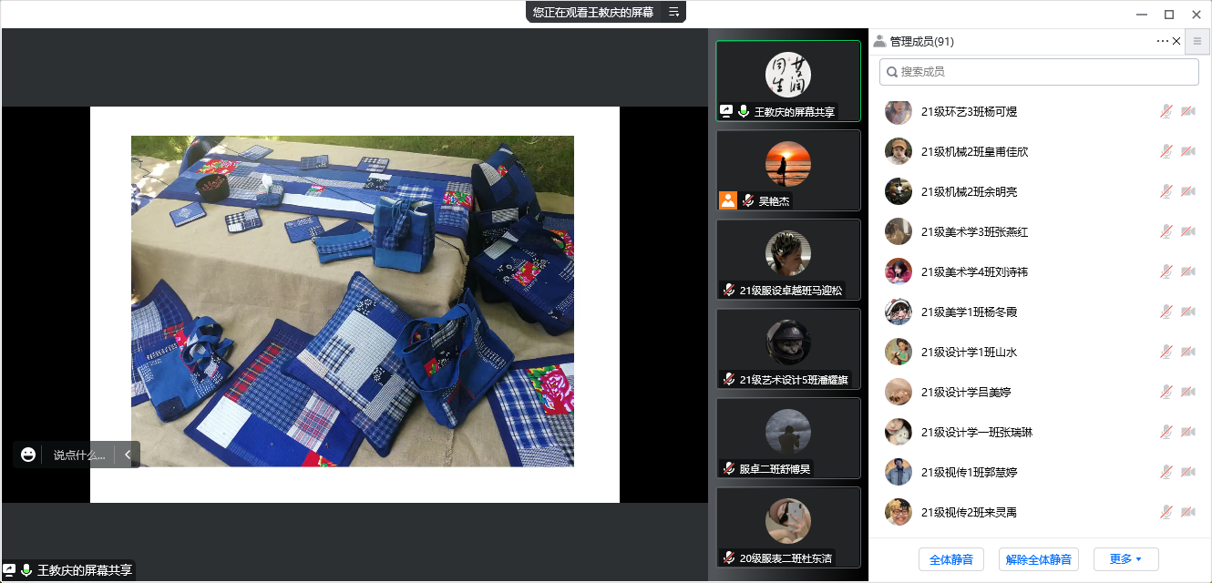 最后王教庆结合自身访学经历,对艺术专业师生如何将家国情怀融入创作,怎样做到“格物知美”做了具体指导。他表示格物为儒家的认识论,指的是研究事物的现象、本质和规律。“格物知美”并非一个成语,是想用它作为当代设计师和艺术家的艺术追求,艺术实践到艺术表达的路径。“格物知美”体现的是一种探索精神,实践精神和对生活美的追求与表达。通过分享他个人访学及教学科研中的故事和民族素材的优秀作品展示,他鼓励艺术专业师生作为青年设计师要做美的创造者、美的使者,文化的继承者、传播者;要超越课本,超越课堂,不断学习思考,不断探索实践,以家国情怀格物知美的精神挖掘中华民族优秀传统文化内涵;让自己的专业和人生追求在全面建设社会主义现代化国家、全面推进中华民族伟大复兴的进程中迸发出更大的能量,成为新时代对国家和社会有用的专业人才。