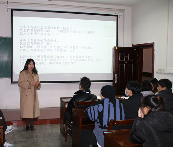 通过本次学长学姐经验交流分享会,同学们对服装设计与工程专业的课程设置,专业特点,考研和就业方向都有了更清晰的认识和更完善具体的规划,明确了自我的奋斗目标,端正了学习态度,相信在未来的学习生活中,同学们将会以学长学姐为榜样,努力学习,砥砺前行。