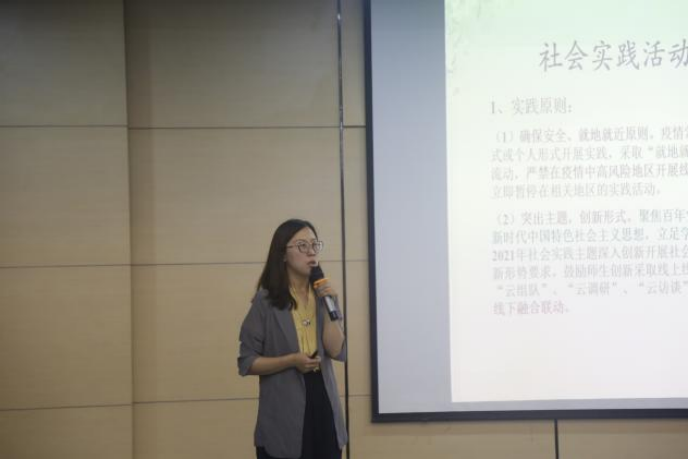 会议伊始,团总支书记马薏雯首先介绍了此次暑期社会实践活动的背景意义,随后马老师从实践主题、参加对象、实践原则、实践形式、实践内容、时间安排以及工作要求七个方面对2021年暑期社会实践活动进行了深度讲解。她还强调;“暑期社会实践活动是一门重要的功课,参与暑期社会实践有助于同学们认识社会,在实践中把握自己。老员工应积极参与,从实践中增强社会责任感,从实践中学真知。”