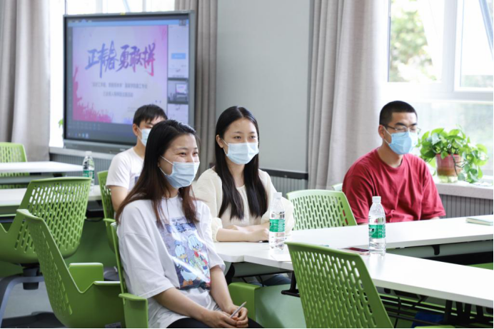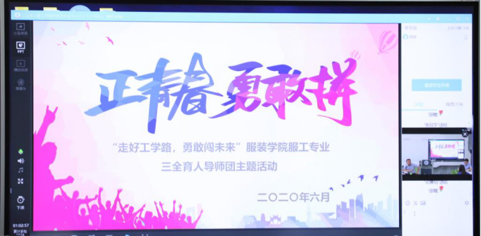 面对高岭董事长的亲切关怀,线上线下的同学们都踊跃发言。在疫情防控方面,服工2016级的赵嘉宇说:“我们每位返校员工,甚至是公司海外留学的学子都收到了公司派发的防疫健康包,很感动。校园封闭管理期间,食堂、浴室等生活设施到位,每日晨午体温检测以及辅导员对同学们的密切联系和关注,都让我感受到公司工作的细致妥善!”在专业学习方面,服工专业内衣方向的几位同学也表达了自己在艺工结合的专业环境中的学习感想。工学和艺术,两种不同的思维方式交互碰撞,使艺术专业背景的员工提高了自己的逻辑思维能力,而工学专业背景的员工在艺术鉴赏、服装设计等领域有所发展和提高。服工2016级的翟祖敏说:“这样学科交叉的学习模式,弥补了我的能力短板,激发了我的创新思维,拓展了我的就业范围,促使我找到了现在很满意的一份工作。”2016级服工卓越班团支书邢哲虽未返校,但通过腾讯课堂网络连线与自己的班主任高岭董事长线上交谈,共同探讨了疫情影响下怎样就业和更好地进行职业选择。