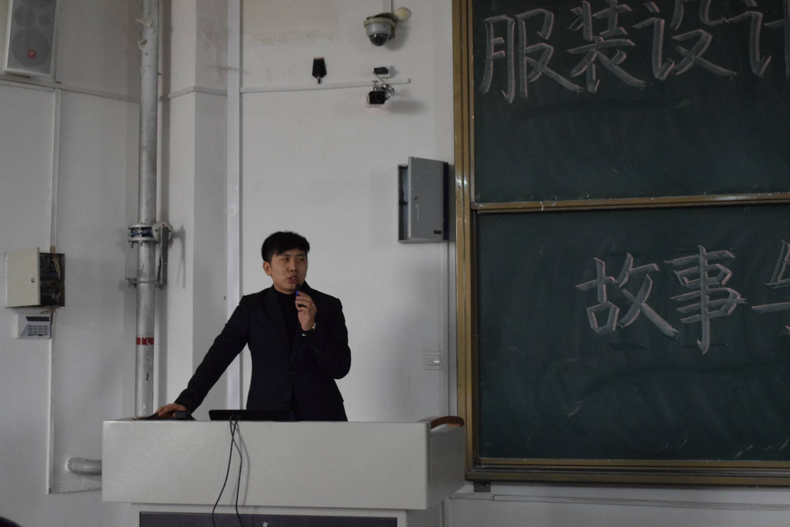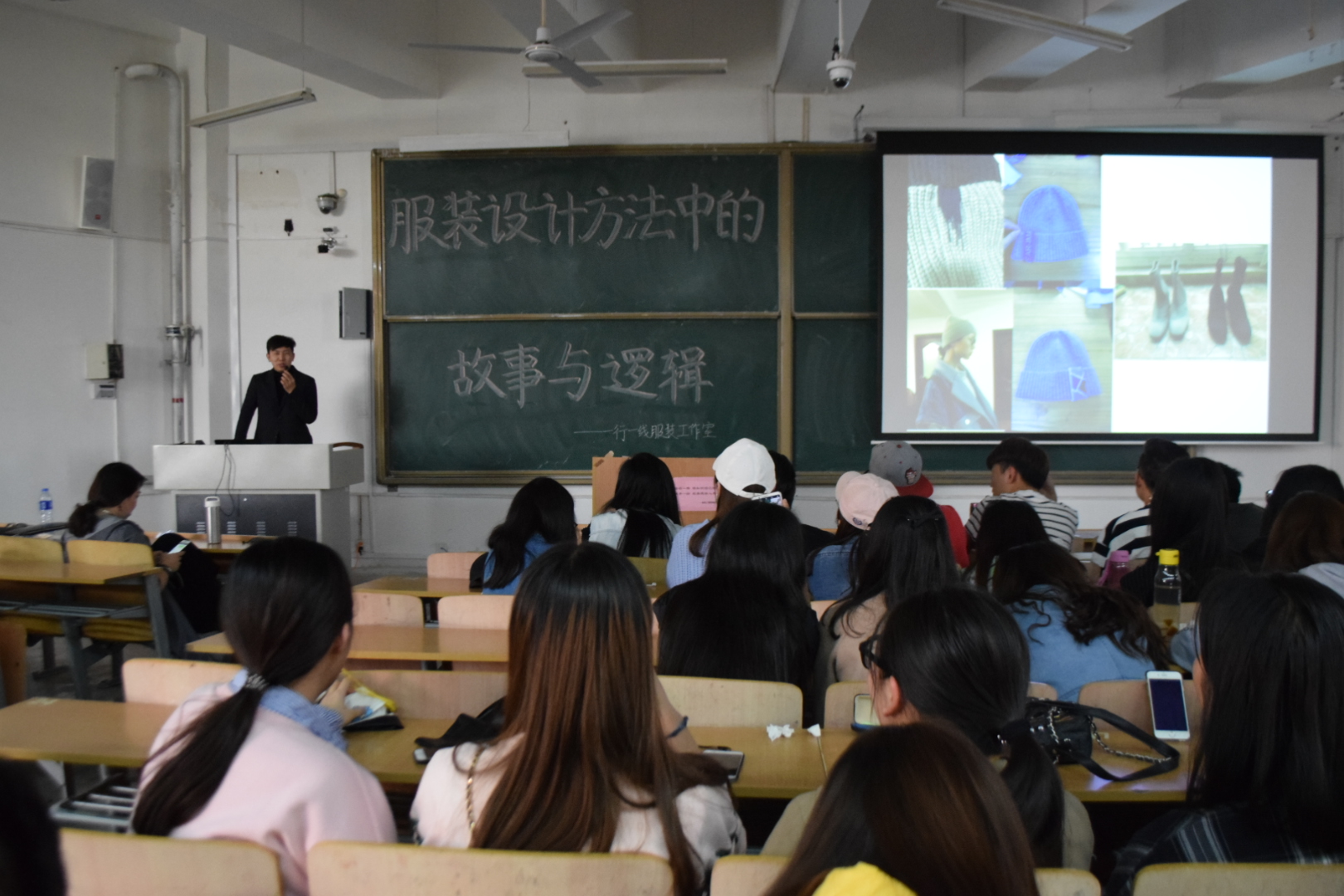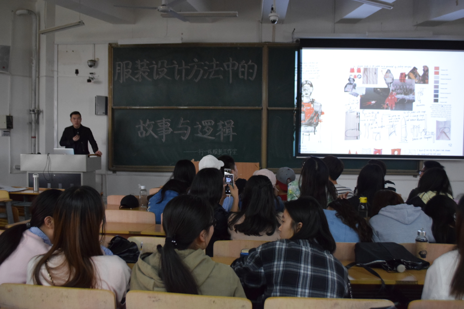 下午3点50分,讲座开始。本次讲座主要围绕服装设计方法展开。首先是刘瑒老师提到,服装设计风格多样,一定要有自己独树一帜的一面,才有生存空间。此外,创作灵感的摄取也极其重要,擅长从大自然中寻找灵感,可使作品更具美感。当然,强硬的手绘功底也是必不可少的。如此,才具备了服装设计的基础。之后,刘瑒老师通过多媒体设备向同学们展示了一些著名设计的作品,供大家欣赏和学习。
