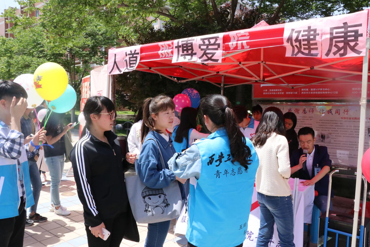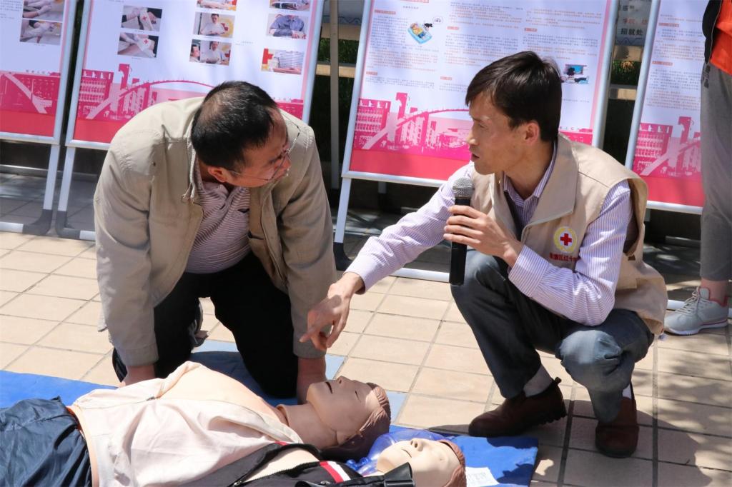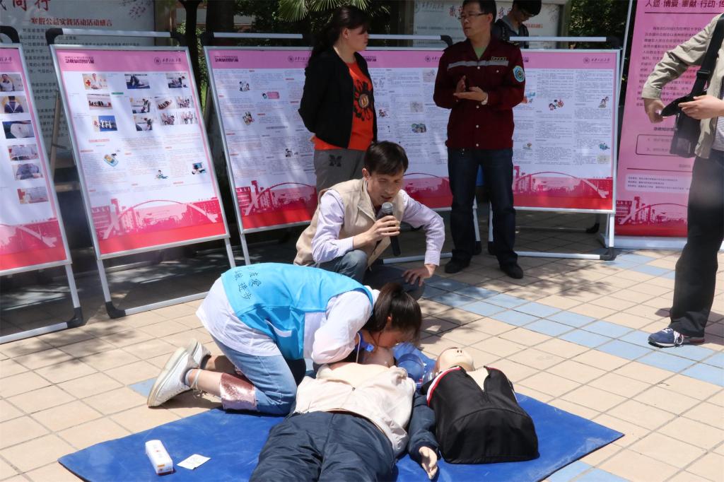 5月8日中午12时,在院青年志愿者分队李存正、牛玉宁和于思含三位同学的组织下,志愿者们在临潼校区中心广场组织了系列活动的现场宣传,临潼区红十字会的工作人员同时进行了精彩的心肺复苏(CPR)户外教学。刚下课的师生们纷纷驻足聆听,几位老师和员工还积极地上台操作演习。现场的学习气氛让大家对后续的活动充满期待。