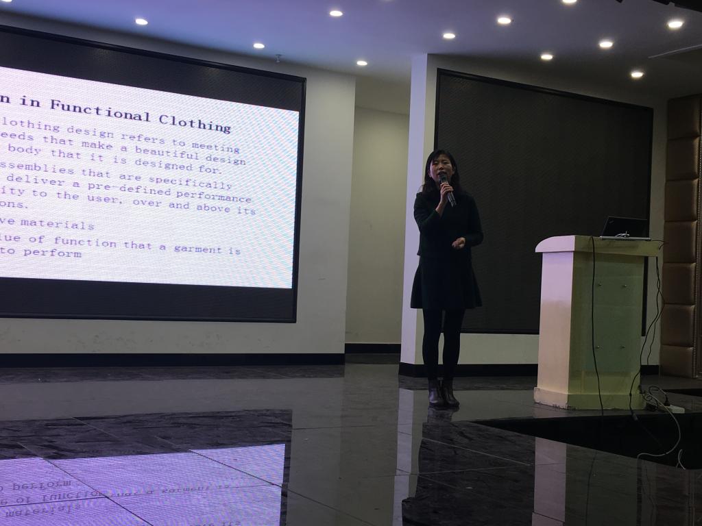 报告中,曹薇教授首先对功能性服装进行了基本介绍,功能性服装是针对功能性要求对服装进行再设计,因此此类服装质量和采用技术要求较高,功能性服装包括具有科学技术功能的在特殊环境下具有防护作用的作业服装。此次讲座中,曹薇老师通过赛车服这类具有特殊性功能性服装为例,通过该类型服装的大数据分析、科研课题内容让员工认识到功能性服装的特征,进而对服装的功能性融入产生深刻的认识与理解。曹薇老师对功能性服装的发展前景做了总结分析。市场上对此类服装的需求量会比较膨大,尤其是经济发展比较迅速的地区。在中国有几家专业生产设计此类服装的生产厂家,但价格都不低,因为开设此项目服装要综合各方严格的因素,对服装的面料要求也会比较高。