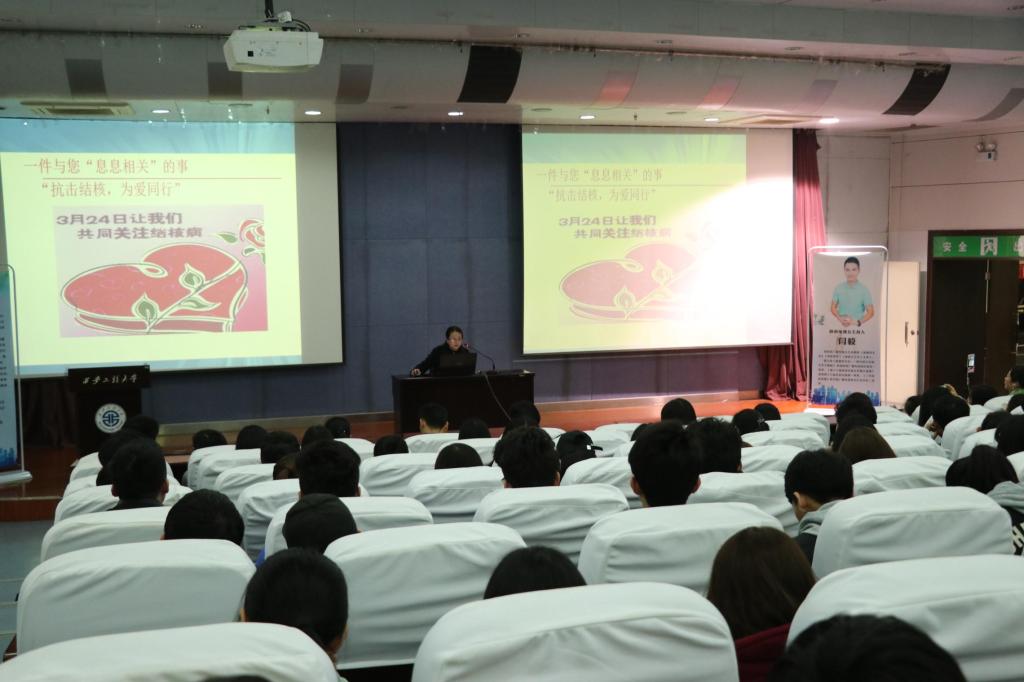 3月24日是第22个“世界防治结核病日”。讲座由闫毅先生主持,他首先询问了同学们日常健康的相关问题。随后,石海萍女士针对肺结核展开系列演讲。她先为同学们讲述了什么是结核病以及结核病病史。其次,她重点为同学们科普了结核病的传播途径、症状、预防方法以及遇到结核病的做法。同学们通过这些知识提高了预防结核病的意识,能够渐渐养成良好的卫生习惯。最后,主持人闫毅上台,与师生进行互动问答,希望更多的年轻人注重健康和日常生活习惯。