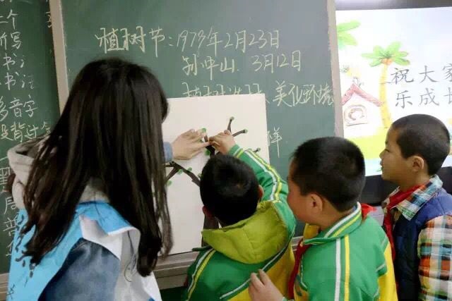 下午2点,支教活动正式开始。志愿者们除了给同学们上课,阐述植树节的由来与含义外,还组织同学们在斜口小学操场种植了一颗“爱心树”,这不仅有利于同学们再实践中体会到植树节的意义,也使青分队志愿者们能从中获得活动实践经验。植树的树苗由青分队提前准备,树苗重量不大,易于志愿者和小员工们开展植树活动。活动中,青分队的志愿者和同学们交往互动融洽,一些志愿者教同学们手工制作小树,他们还进行了成语接龙等比赛,这些比赛极大的激发了同学们的上课热情。