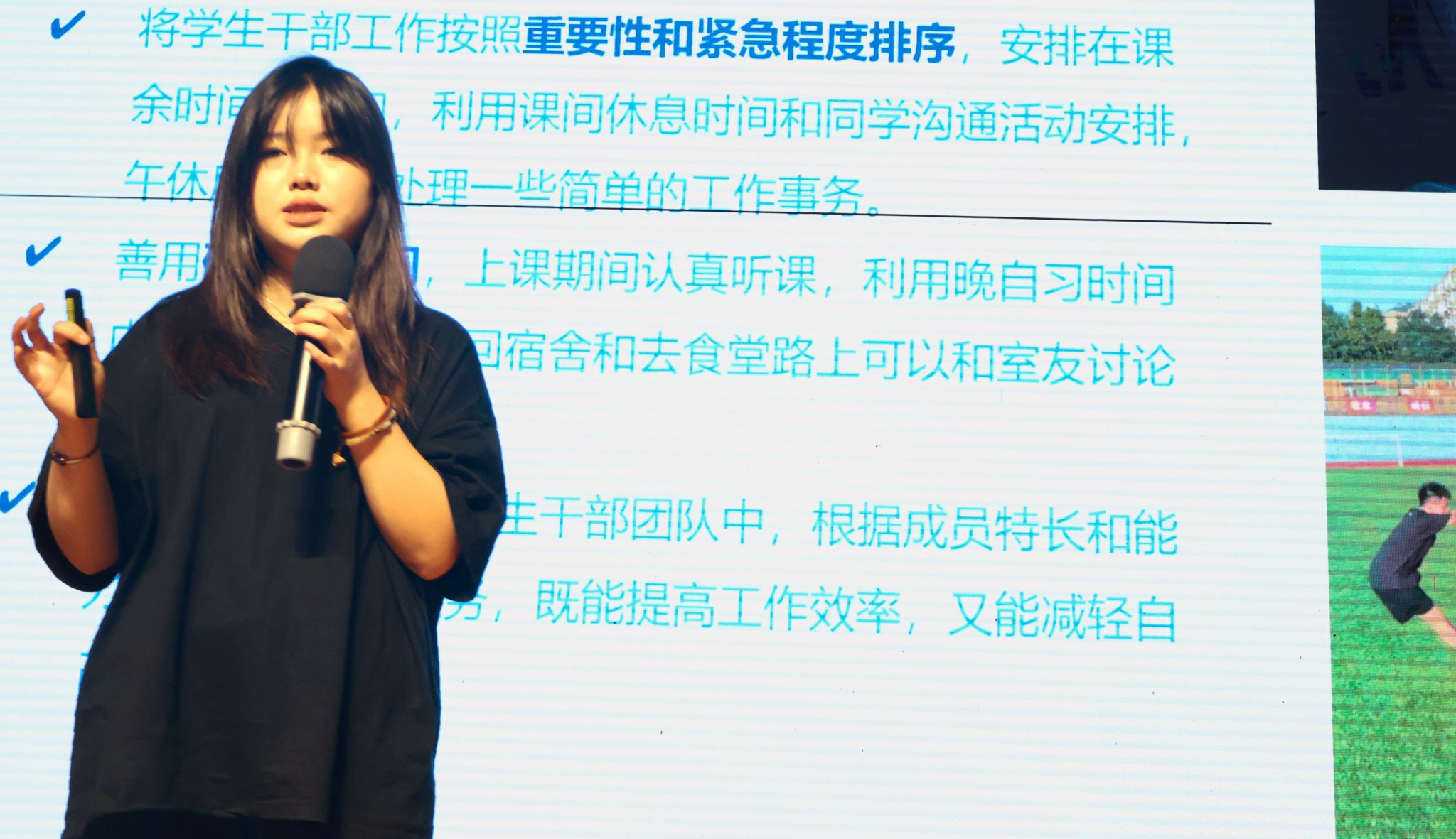 大会的第二部分是学长学姐的经验分享。本次分享邀请了2020级环境艺术专业的苗卓和2021级产品设计专业的周德云。他们详细讲述了自己在大学期间的学习规划,强调了制定合理的学习目标的重要性,并分享了如何有效管理时间,平衡课业与个人兴趣等方面的内容。
