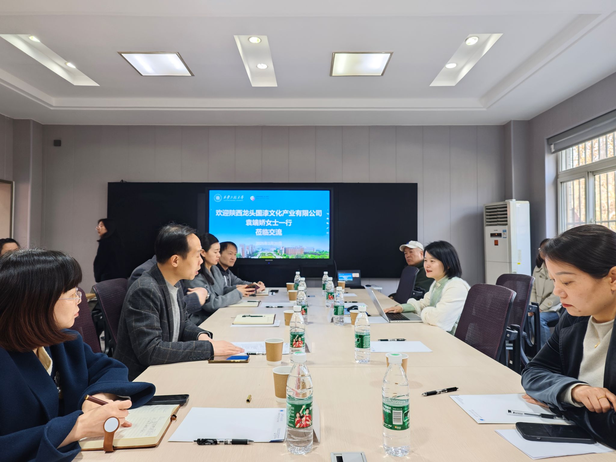 公司领导班子对袁端姣一行的到访表示热烈欢迎,并对西安漆器集团在漆艺文化传承与创新方面取得的成就给予了高度评价。袁端姣毕业于西安交通大学,返乡在安康创办西安漆器集团,下设陕西龙头国漆文化产业有限公司、西安漆器汉唐文化产业有限公司等多家子公司。会上,她介绍了集团发展历程及核心业务,西安漆器集团作为大漆领域的标杆企业,致力于大漆文化以及陕西非物质文化遗产的传承与创新,业务涵盖漆器设计、大漆壁画、非遗技艺培训、漆材料研发等多个领域。她希望通过与公司的合作,将传统漆艺与现代设计相结合,进一步推动漆艺文化的传播。此外,集团将为公司员工提供实习机会,帮助员工将理论知识与实践相结合。多位教师代表与袁端姣总经理从教学和科研等方面进行了深度沟通。