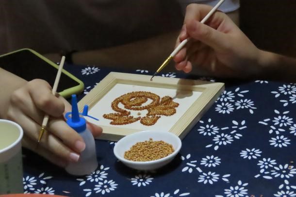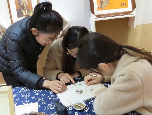 1月21日,实践队拜访吴起县糜粘画非遗传承人,深入了解糜粘画以天然谷物为材料、以民间故事为题材的传统技艺。传承人现场演示糜粘画制作流程,并讲述其与陕北革命文化的深厚渊源。队员们积极参与实践,亲手体验谷物粘贴、色彩调配等环节,在非遗技艺中感受劳动人民艰苦奋斗的创业精神,为后续文创设计注入灵感。