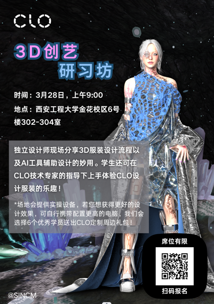 CLO 3D创意研习坊,独立设计师现场分享3D服装设计流程以及AI工具辅助设计,名额有限,优秀学员有礼包,欢迎老师们和员工报名。