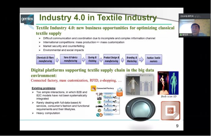 曾宪奕教授首先介绍了法国工程师教育在法国高等教育体系中的地位,接着介绍了法国鲁贝高等艺术与纺织工艺公司(ENSAIT)和法国纺织材料与工程国家重点实验室的相关情况,重点讲授了计算机与纺织服装交叉领域中的大数据和人工智能在纺织服装产业供应链创新研究,以及相关软件开发实例。整个学术报告给师生们让师生们对服装产业供应链创新的前沿科技与技术有了直观印象,师生受益匪浅。报告结束后,曾教授还与公司师生进行了深入交流,提了一些做科研的建议和意见。参会师生表示此次学术报告内容新颖、时效性强、收获很大,对进一步做好科研,发表高水平的学术文章较好的指导作用。
