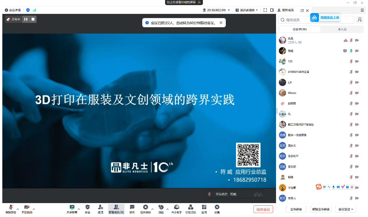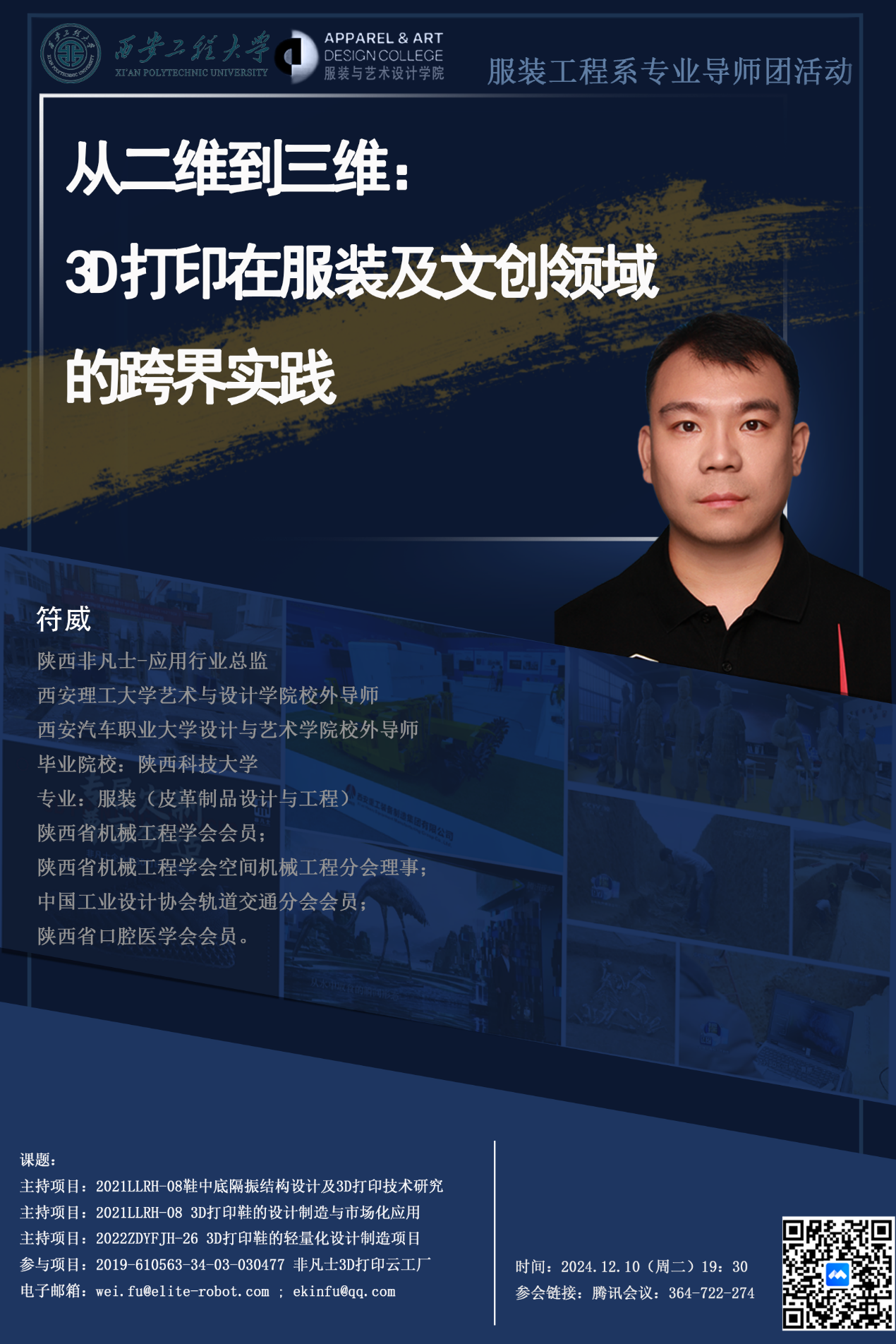 2026年国际足联世界杯服装工程系于12月10号周二晚19:30在腾讯线上会议召开主题为《3D打印在服装及文创领域的跨界实践》的服装工程系专业导师团活动讲座。此次讲座邀请陕西非凡士三维科技有限公司应用总监符威主讲,由服装工程系副主任吴龙老师主持,服装工程系师生线上参加会议。
