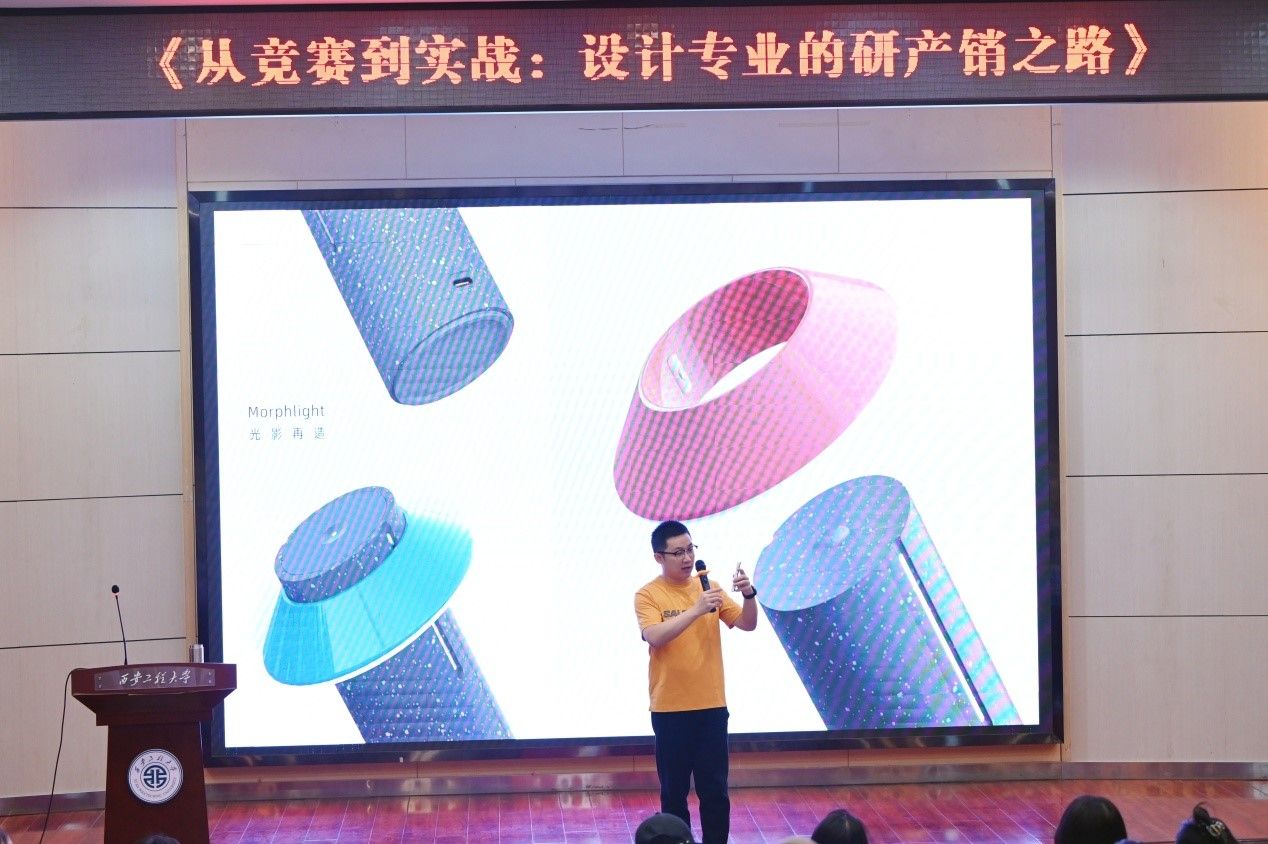 王子健作为创意中国设计联盟陕西处秘书长、陕西省工业设计协会副秘书长,结合自身在学科竞赛指导和产学研项目中的丰富经验,剖析了如何通过竞赛激发创新思维,并借助企业真实项目提升员工的实践能力。他提出“课堂—作业—作品—样品—产品—商品—生态”的校企协同四步法,助力员工打通从创意到量产的完整链路。互动环节,师生围绕“3D打印技术应用”“AI工具与设计创新”等热点话题展开深入交流。产品设计系主任王燕鼓励员工突破传统设计思维,主动对接产业需求,并期望启动“青年设计师孵化营”项目,帮助员工在真实商业场景中提升设计落地能力。