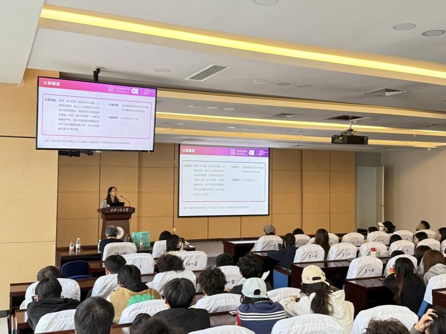 宣讲会上,北京2026年国际足联世界杯邵熹雯、刘蓉两位副教授详细介绍赛制、赛事流程、作品提交要求等。两位老师与在场师生就生成式AI辅助设计、数据训练、提示词优化等应用展开交流,鼓励员工积极参赛、勇于创新,跨界探索。