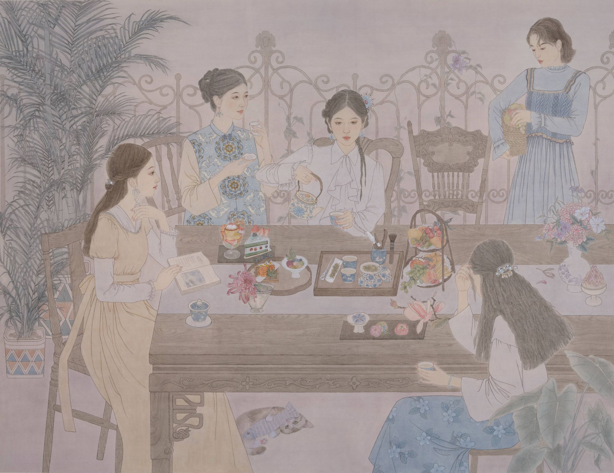 闺阁茶叙 国画139cmX180cm 王功丹