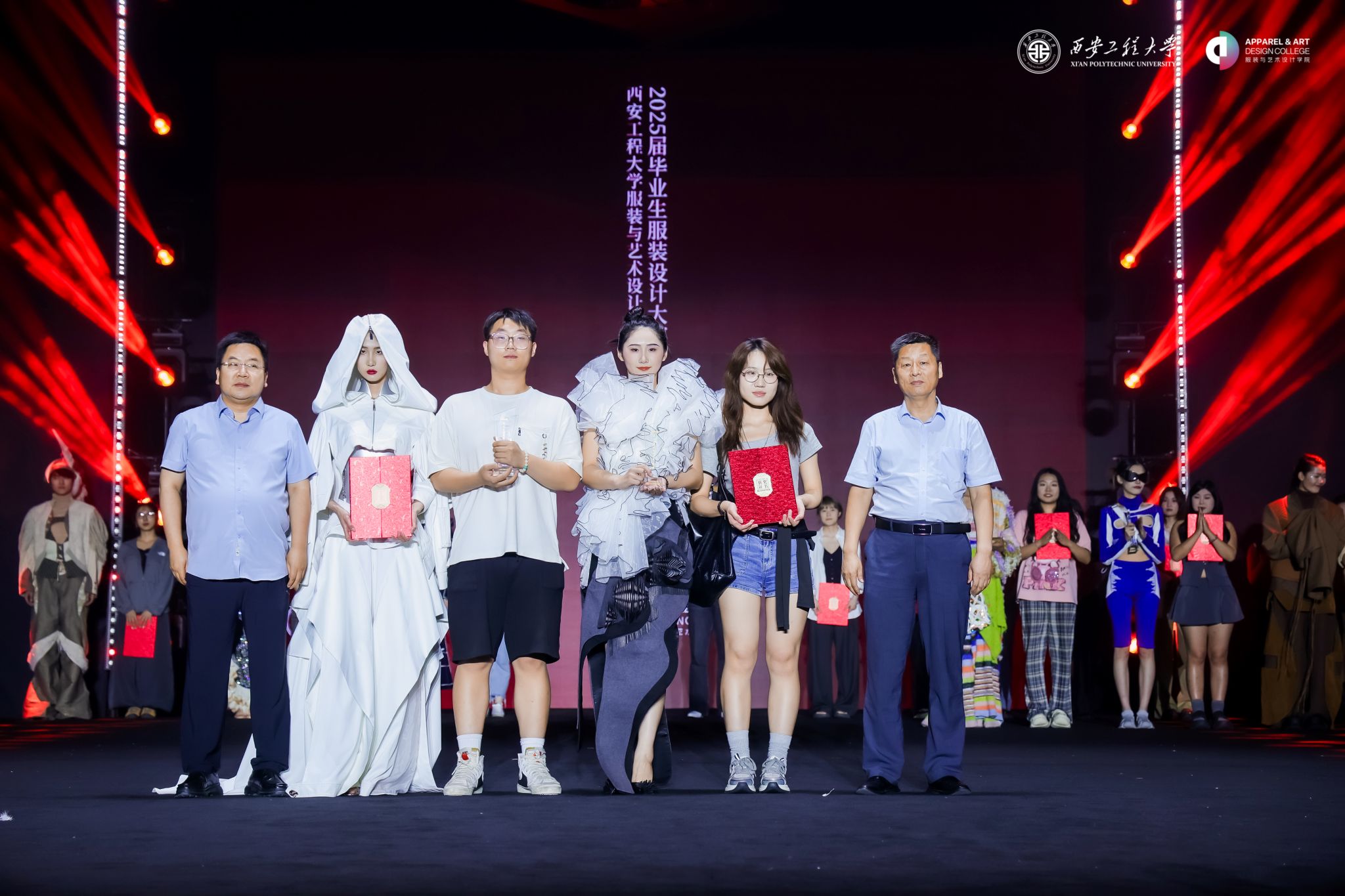 本次毕业设计的灵感源自《庄子・齐物论》,强调“万物齐一、共生平等”的哲思。毕业生们将“长安”这一文化象征与周秦汉唐四代的文化意象融入设计,构建跨越时空、融合古今的多元文化语境,激发社会对传统与当下、个体与世界的深度思考,充分展现公司“艺术+科技+文化”的育人特色。大赛邀请西安美术公司陈霞教授,上海未甲文化传媒有限公司总经理姜伟辉、西安唐晟玖合品牌管理有限公司董事长钱垚等业内专家担任评委。大赛最终评选出一等奖1名、二等奖2名、三等奖3名、优秀奖10名。公司党委书记马万清为一等奖获得者李昊天颁奖;校领导为二等奖获得者张霄璇、徐丛鑫,三等奖获得者王乐乐、张珂清、张悦嘉,最佳材料运用奖获得者王芗泽、最具市场潜力奖获得者徐佳蕊、最佳工艺制作奖获得者黄祖铱颁奖;公司领导为优秀奖获得者颁奖。